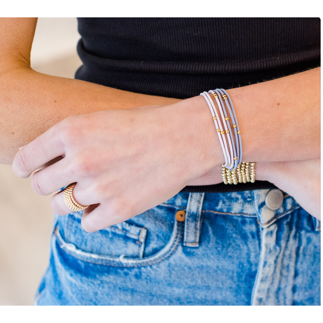 These 14k gold-filled Water Pony™ hair bands are stretchy, stylish, and waterproof. With nine gold-filled beads on each band, they look great on your wrist or in your hair. Perfect for all activities, they won’t tarnish and fit wrists up to 7 inches. Available in light blue and white for an upscale and effortless look.
